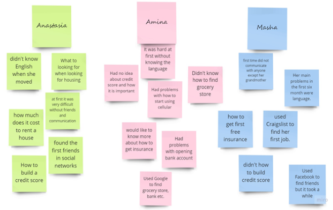 After conducting secondary research, I wanted to study the real immigrants experience , so that the future product meets their needs. To do this I conducted a  survey in social networks and, based on it, selected 3 participants for an interviews.