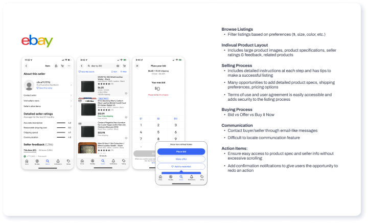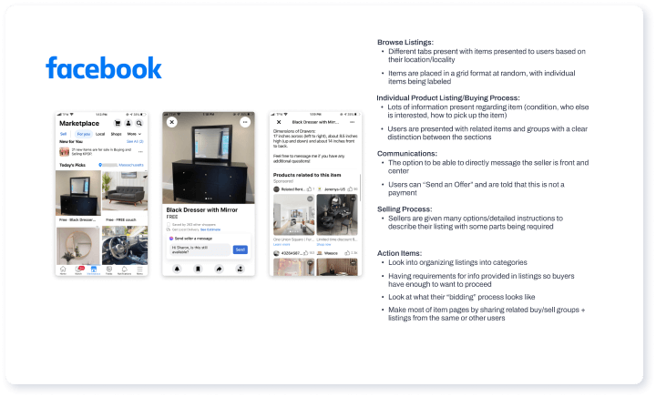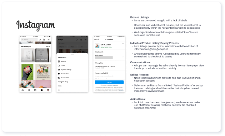 Direct competitors, Poshmark, eBay, Facebook Marketplace, and Instagram Shopping, gave us insight into UI design patterns that we can directly use in the redesign.