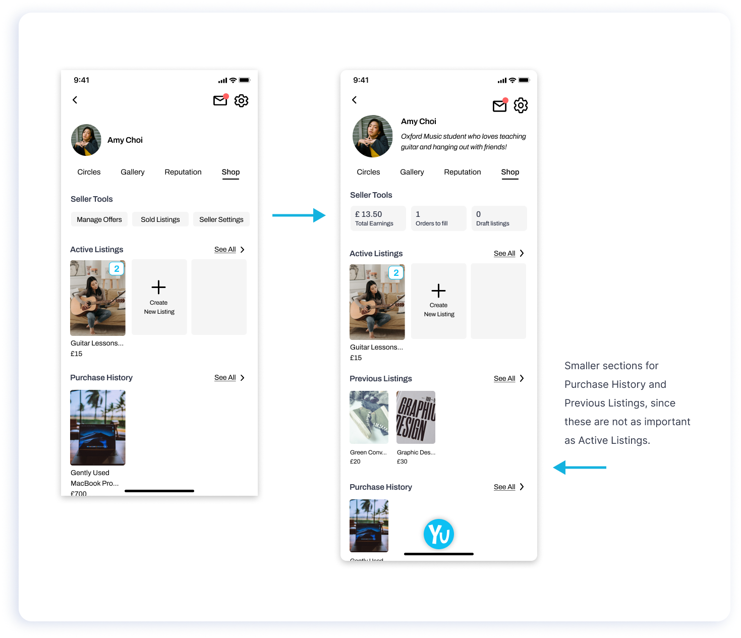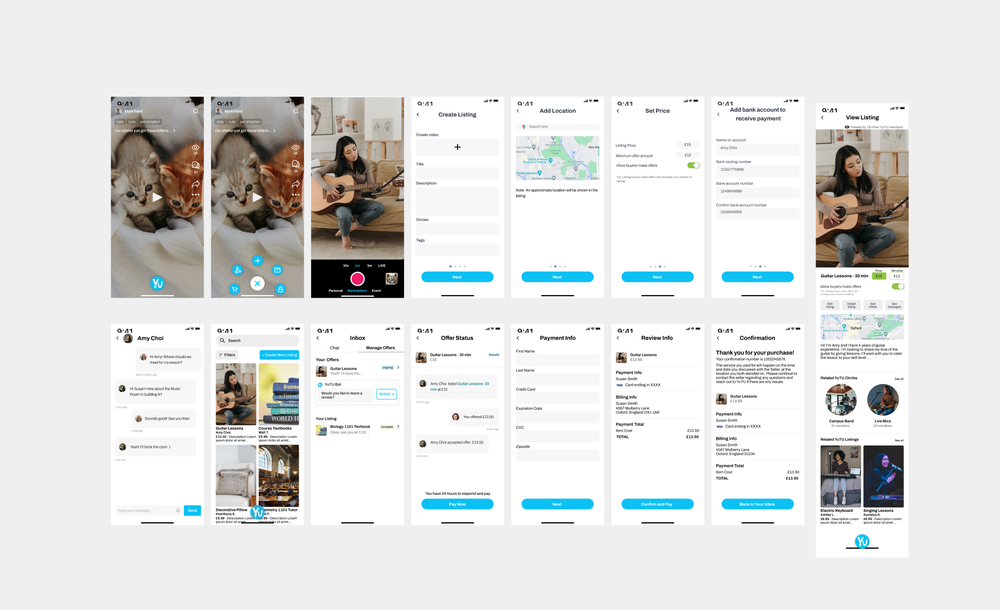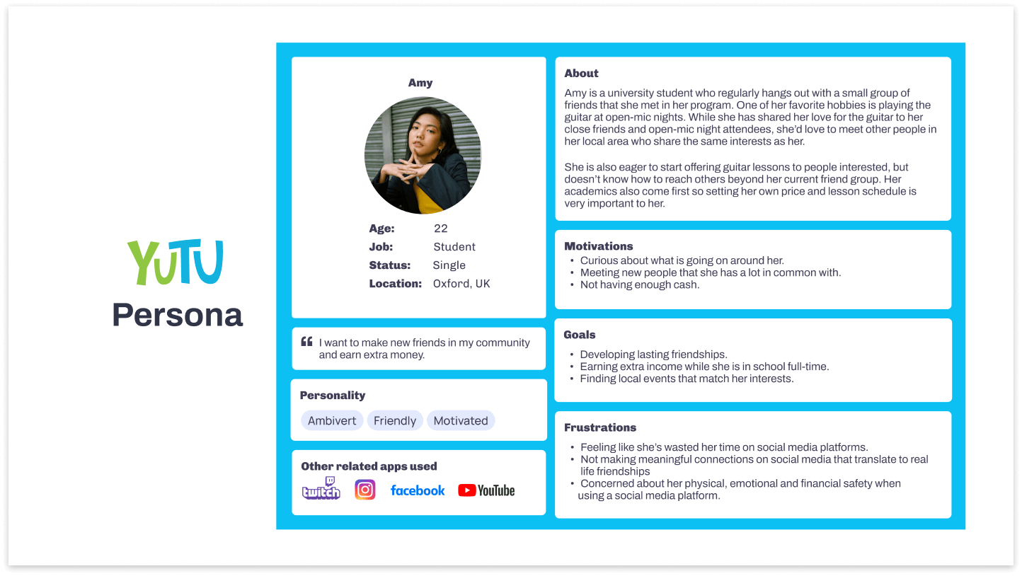 The primary user, Amy is looking to give guitar lessons to make extra income as well as connect with more people who have a passion for guitars.